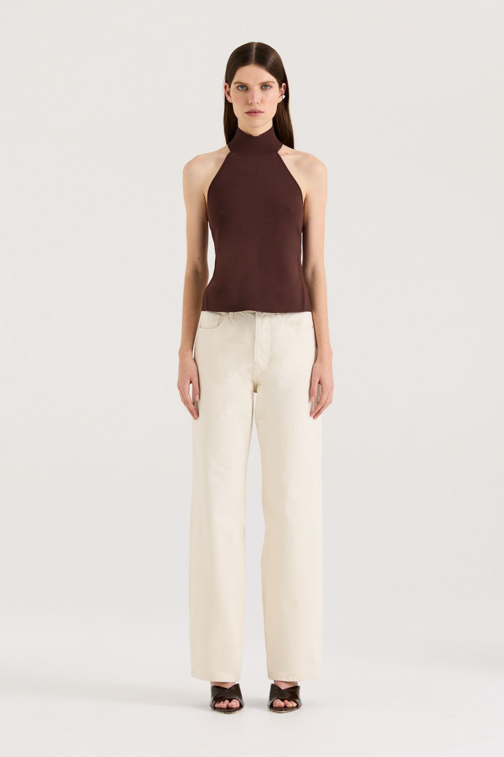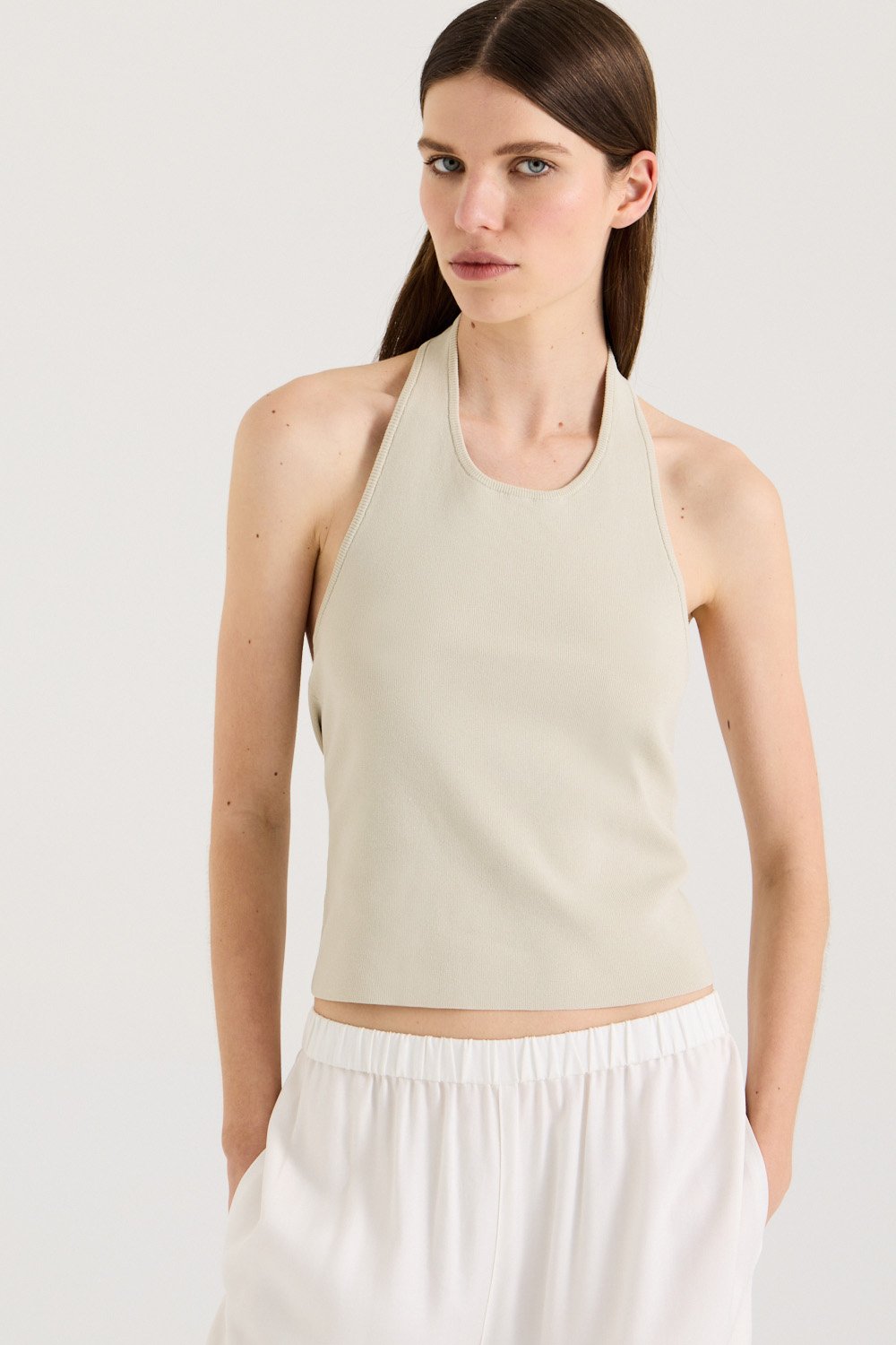 Rediscover our best-selling Anella Top in a new Light Khaki - Designed in a halter-neck silhouette, featuring low-back, twist detailing. Anella is crafted from a fine-knit fabrication in a fresh white hue. Effortlessly pair back with your favourite denim this season.